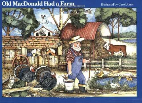 This book has amazing drawings in it. Carol Jones is very talented. I rarely write reviews for books but this one has definitely impressed me. Not only are the pictures breathtaking, but many of the pages have a circular hole cut out of the middle so you get a peek at the next animal coming up in the tale, and when you look back at the previous page from the other side, you see Old MacDonald. This is truly a gem of a book. My highest praises to the illustrator!
